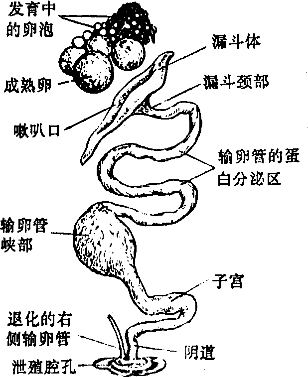 雌鸟的输卵管,在胚胎期是左右成对的,成鸟的右侧输卵管一般退化(隼形目多数个体例外),而仅有左侧输卵管,这与适应空中飞翔生活和产生大型硬壳卵有关。幼鸟的左输卵管不发达,呈白绒状。成鸟的左输卵管较长,管壁的肌肉层宽厚,并有较多的弯曲,前端为宽大的漏斗,开口(喇叭口)于左卵巢附近的体腔内,可接受来自卵巢的成熟卵。根据左输卵管的结构与功能,可区分为3段:上段称腺体部(精子与卵细胞在此融合成受精卵),此段管壁粘膜层的腺体,可分泌大量较浓的卵白(卵带在此形成);中段称峡部,管道狭窄,可分泌形成内外壳膜的物质和稀卵白;下段为子宫部,管壁较薄,并膨大呈囊状,主要分泌形成钙质卵壳的物质,所以又称壳腺部。子宫的下面为短小的阴道,开口于泄殖腔内。有些卵壳上具有各种不同的色彩式斑纹,是由左输卵管下段末端管壁上的色素细胞,于卵产出前5~6小时而分泌形成的。1个成熟卵在整个左输卵管内,一般要经过21~23小时方可排出,在上段腺体部约经3个小时,在中段峡部约经2~3小时,在下段子宫部,正常时约经16~17小时。