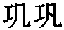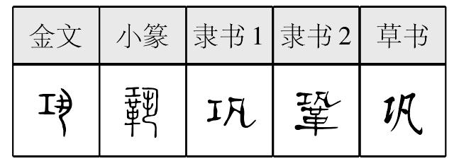 巩 金文; 篆gǒng[工(刑具,意符)+丮(手被綁的奴隸,聲符)→ (《説文》:“巩,袌(bào抱)也。從丮(jǐ握持),工聲。”不確。巩,古文像以斧斤(工,聲意符)欲砍斷戴桎梏的人(丮,奴隸)的雙手。受刑的奴隸内心當然十分“恐怖”,奴隸社會就是使用這種鎮壓手段來“鞏固”其統治的。“巩”實爲“恐”和“鞏”本字。)] 巩鞏gǒng(6画)