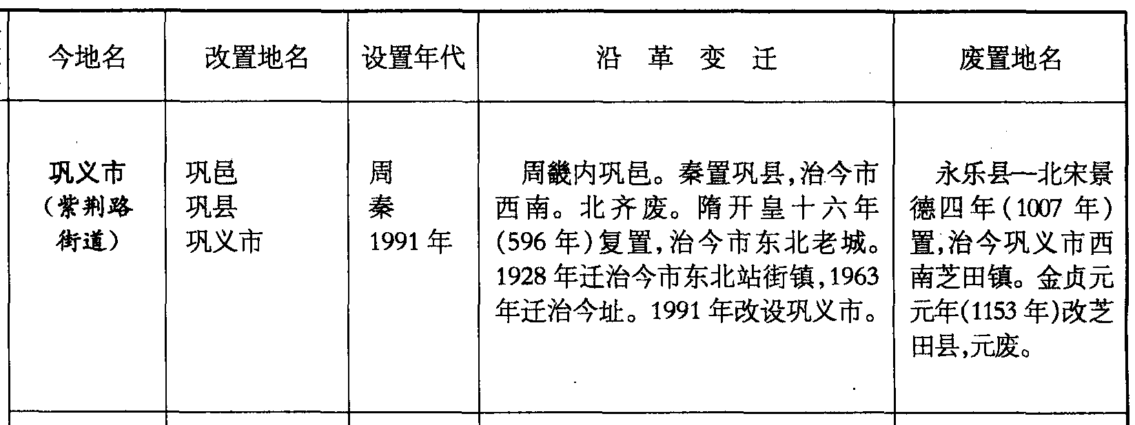 巩义市(紫荆路街道)巩邑巩县巩义市周秦1991年周畿内巩邑。秦置巩县,治今市西南。北齐废。隋开皇十六年(596年)复置,治今市东北老城。1928年迁治今市东北站街镇,1963年迁治今址。1991年改设巩义市。永乐县—北宋景德四年(1007年)置,治今巩义市西南芝田镇。金贞元元年(1153年)改芝田县,元废。