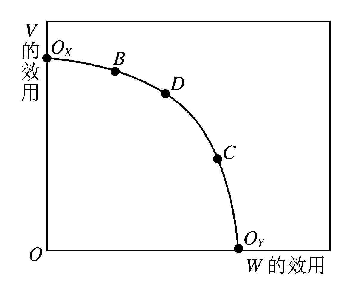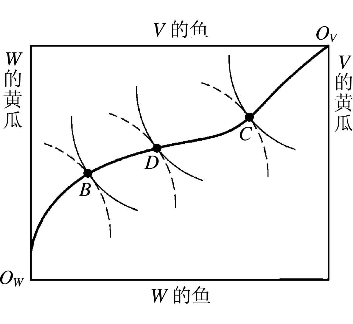 释义 | 帕累托最优的交换条件福利经济学中满足消费品的帕累托最优配置的条件。在消费品配置中,如果在不减少一些人效用的情况下,可以增加另一些人的效用,那么这种配置是可以进一步改进的,因此被视为无效率配置;如果不减少一些人的效用,就不能增加另一些人的效用,这种配置被称为“消费品的帕累托最优配置”。满足消费品的帕累托最优配置的条件被称为“帕累托最优的交换条件”。这一条件是,对任何两个消费者来说,任何两种消费品的边际替代率都相等。这时,消费者的效用达到最大化。这一条件表现在等效用曲线图上,就是两个消费者的等效用曲线的相切点。等效用曲线上的点的斜率的绝对值是两种消费品的边际替代率。在切点上,两条等效用曲线的斜率相等,因此其边际替代率相等。以两个消费者(W和V)之间分配两种消费品(鱼和黄瓜)为例。图1是一种盒形图,其横向长度为全部可供分配的鱼的数量,纵向为全部可供分配的黄瓜的数量。图中下面的横轴表示消费者W所拥有的鱼的数量,左边纵轴表示其所拥有的黄瓜的数量,以左下角的OW为原点,AB曲线为其等效用曲线(即无差异曲线);上面的横轴表示消费者V所拥有的鱼的数量,右边纵轴表示其所拥有的黄瓜的数量,以右上角的OV为原点,AC曲线为其等效用曲线。消费者V的等效用曲线是消费者W的等效用曲线旋转了180度。这种盒形图称为“埃奇沃斯盒形图”。以两条等效用曲线的交点(A点)作为初始分配点。这时,消费者W有6单位鱼和2单位黄瓜;消费者V有1单位鱼和14单位黄瓜。两人总共有7单位鱼、16单位黄瓜。这是全部可分配的资源,现重新配置。消费者W在A点时愿意用1单位鱼换取0.5单位黄瓜,在这点他鱼多黄瓜少,所以对黄瓜的效用评价很高。这样,在A点,消费者W的鱼对黄瓜的边际替代率为0.5。消费者V在A点时为了多增加1单位鱼而愿意放弃6单位黄瓜,在这点他鱼少黄瓜多,所以对黄瓜的效用评价很低。这样,在A点,消费者V的鱼对黄瓜的边际替代率为6。重新配置的可能结果是,消费者W用1单位鱼可以换到0.5单位至6单位黄瓜。假定消费者V交出6单位黄瓜换回1单位鱼,而消费者W交出1单位鱼换回0.5单位黄瓜,这样就有5.5单位黄瓜没有进入最终分配,也就是全部可供分配的资源没有被充分利用。只要两个消费者的边际替代率不同,即只要两条等效用曲线相交,就有进一步互利分配的余地,而交点(比如A点)的配置则是无效率配置。只有在两条等效用曲线所围成的区域内,使两条曲线相切的点(如图1中D点),包括在等效用曲线上相切的点(图1中的B点和C点),均为帕累托最优配置点。在D点,消费者W从4单位鱼减到3单位鱼时,他换回2单位黄瓜,鱼对黄瓜的边际替代率为2;与此同时,消费者V从3单位鱼增加到4单位鱼时,他用了2单位黄瓜去换鱼,鱼对黄瓜的边际替代率也为2。此时,消费者W拥有3单位鱼、10单位黄瓜,消费者V拥有4单位鱼、6单位黄瓜,全部可供分配的资源均得到有效配置。在D点,在不减少别人效用的情况下,就不存在使自己继续增加效用的可能。 图1 将消费品的所有可能的帕累托最优配置点连接起来的曲线,称为“交换契约曲线”,即图2中连接各切点B、D、C的曲线。 图2 交换契约曲线可以转换为“效用可能性边界”。图3以消费者W所获得的效用为横轴,以消费者V所获得的效用为纵轴,给出效用可能性边界。图3中,在OX点,消费者W没有消费品,效用为零;从原点O越向右的方向,其效用越大。在OY点,消费者V没有消费品,效用为零;从原点O越向上的方向,其效用越大。效用可能性边界上的点对应着交换契约曲线上的点,它表明两个消费者通过交换达到消费品的最优配置时每个人的效用水平。不在效用可能性边界上的点,均为无效率配置点。 图3 帕累托最优配置及其条件是通过市场机制实现的。在一个竞争性市场中,有众多的买者和卖者,他们都寻找对自己有利的价格进行交换。这样他们都把市场价格看做是既定的,即他们都是价格接受者,都以此来决定买和卖的数量。当对一种商品的需求大于供给或者供给大于需求时,市场价格将会调整,随之,供求数量也会相应调整,直至供求均衡。这时,两种商品的价格之比决定了其交换的比例,也就是两种商品的价格之比确定了不同交易者购买和出售商品的数量。消费者均衡条件为两种商品的价格比率等于消费者关于这两种商品的边际替代率。以PX代表鱼的价格,PY代表黄瓜的价格,MRSXY代表消费者关于鱼和黄瓜的边际替代率,则消费者均衡条件可写为: MRSXY=PX/PY 对所有交易者来说,在完全竞争市场中,他们都面对既定的相同的价格比率,因此他们的等效用曲线的边际替代率均相等,这正满足了帕累托最优配置的条件。在完全竞争市场中,通过个人追求自身利益最大化和价格的调整所实现的均衡,即完全竞争均衡,在经济上是帕累托最优配置。这被称为“福利经济学第一定理”。福利经济学第二定理是第一定理的逆定理,即指资源的每种帕累托最优配置,对于其初始配置来说都是竞争性均衡。在帕累托最优配置下,两种商品的交换比例决定了其价格之比,也就是两种商品的交换比率确定了不同交易者购买和出售商品的价格,这一价格之比使供求达到均衡。 |