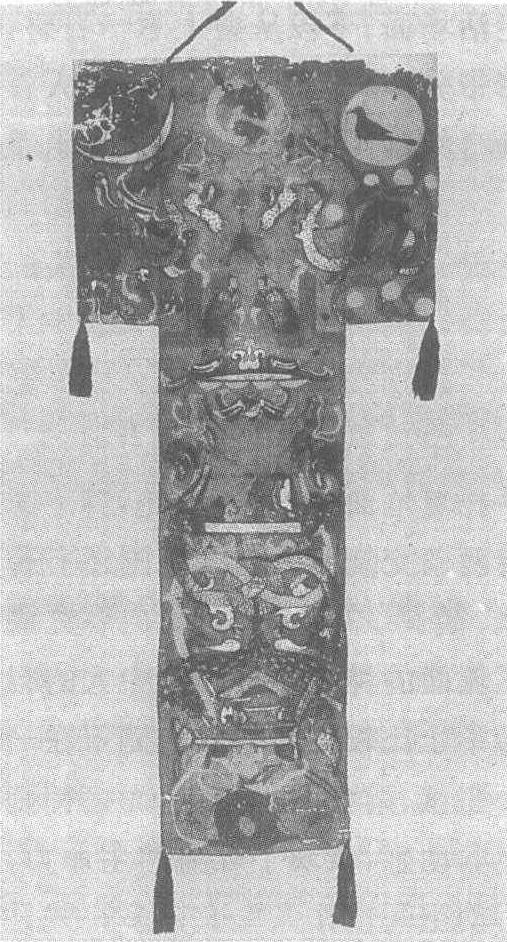 释义 | 帛画引魂升天图(2件) 帛画引魂升天图(2件)西汉。绢本设色。纵205厘米。上横92厘米,下横47.7厘米。湖南省博物馆藏。1972年湖南省长沙市马王堆1号汉墓出土。此件帛画(又称“非衣”、 “铭旌”。)成“T”字形,覆盖在内棺的棺盖上,墓主人是西汉长沙国丞相第一代驮侯利苍妻子,葬于汉文帝四年(前176年)。帛画内容可分为天上、人间、地下三部分。横幅部分描绘了天界情景:右方生长着一株曲转如带的扶桑树,树枝间生出九个太阳,下面八个较小,上面一个很大,日中有一只金乌;与红日对称的左上角则有一弯新月,月芽之上载有玉兔和口吐云气的蟾蜍;日月之间是人首蛇身的女娲,上身着衣袍,身体的下部的红色蛇身环绕蟠屈,女娲的长发垂搭其上,她周围是七只或飞翔,或驻足长鸣的神鸟;日月之下是两条腾空的龙,左侧有翼的是传说中的应龙,一个女子乘着龙翼,双手攀月,有人认为是“嫦娥奔月”的情节,也有人认为是死者灵魂乘龙升天的内容;两龙之间悬一特钟,二个兽首人身的怪神各骑一只腾跃的异兽;钟的下面是天门,门阙上伏豹,两个人间官吏打扮的神拱手对坐,仿佛是在准备迎接将要升入天国的灵魂。人间、地下两部分绘在竖幅上。由两条穿璧长龙贯通,交错的龙身又将人间部分分为上下两段。上段在两豹托起的平台上,墓主人身着锦衣,拄杖缓行,身后立着三个女侍,前面有两个侍者捧案跪迎,他们头上罩着一个鸮鸟托起的华盖,它可能表现了墓主人死后的生活场面。下段从璧上悬一石磬,彩带分飘,彩带上分立两个人首鸟身的神怪;磬下桌案旁跪坐着七个人,案上摆着各种盛食物的器皿,地面上也摆着鼎、壶之类的食具,反映了死者家属为墓主人设宴送别或祭祀的场景。地下部分正中一赤裸身体的大力神,双手托着地面,他骑着长蛇,脚下踩着两条交绕的大鱼,周围还有神龟、鸱鸮、神怪等。帛画内容充满了瑰丽的神话色彩。图中人的行为举止比较安静、平和,笼罩在一片庄重、肃穆的气氛中;而诸神则充满动感,表现了旺盛的生命力,活动空间也比人世大得多,并且构成了人世间的框架。诸神形貌奇特,造型夸张,各种飞动的线条交织在一起,在鲜艳的色彩衬托下,与人间的活动形成了强烈对比。在布局中,作者充分运用了对称平衡的表现手法。神世的内容虽然丰富多彩,却并不给人以杂乱无章的感觉。世间人物取平面排列,注意神态描摹,老妇人的蹒跚步履、侍从们的恭敬表情都刻画的十分生动。此图以淡墨起稿,再平涂各色颜料,兼以局部渲染,然后再细勾墨线。整幅画面精致而华丽。1971年,在埋葬轪侯之子的马王堆3号汉墓中还出土了一件形式内容与此大致相仿的帛画,比1号墓帛画略大,长233厘米,上宽141厘米,下宽50厘米。也分天上、人间、地下三部分,可知这种“非衣”是有固定格式的。略有不同的是,3号墓帛画中扶桑树只生有一个太阳,没有“奔月”的内容,天空中画有星辰,人首蛇身的女性旁为一裸露上身的男子,墓主人戴冠佩剑,身着红袍,前有三人恭迎,后有六人随侍。而艺术水平略逊前者。 ☚ 帛画导引图 帛画车马仪仗图 ☛ |