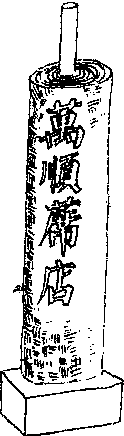 将席子卷起,用黑字书写上店号。竖在店前,作为出售席子的标记,属实物幌。