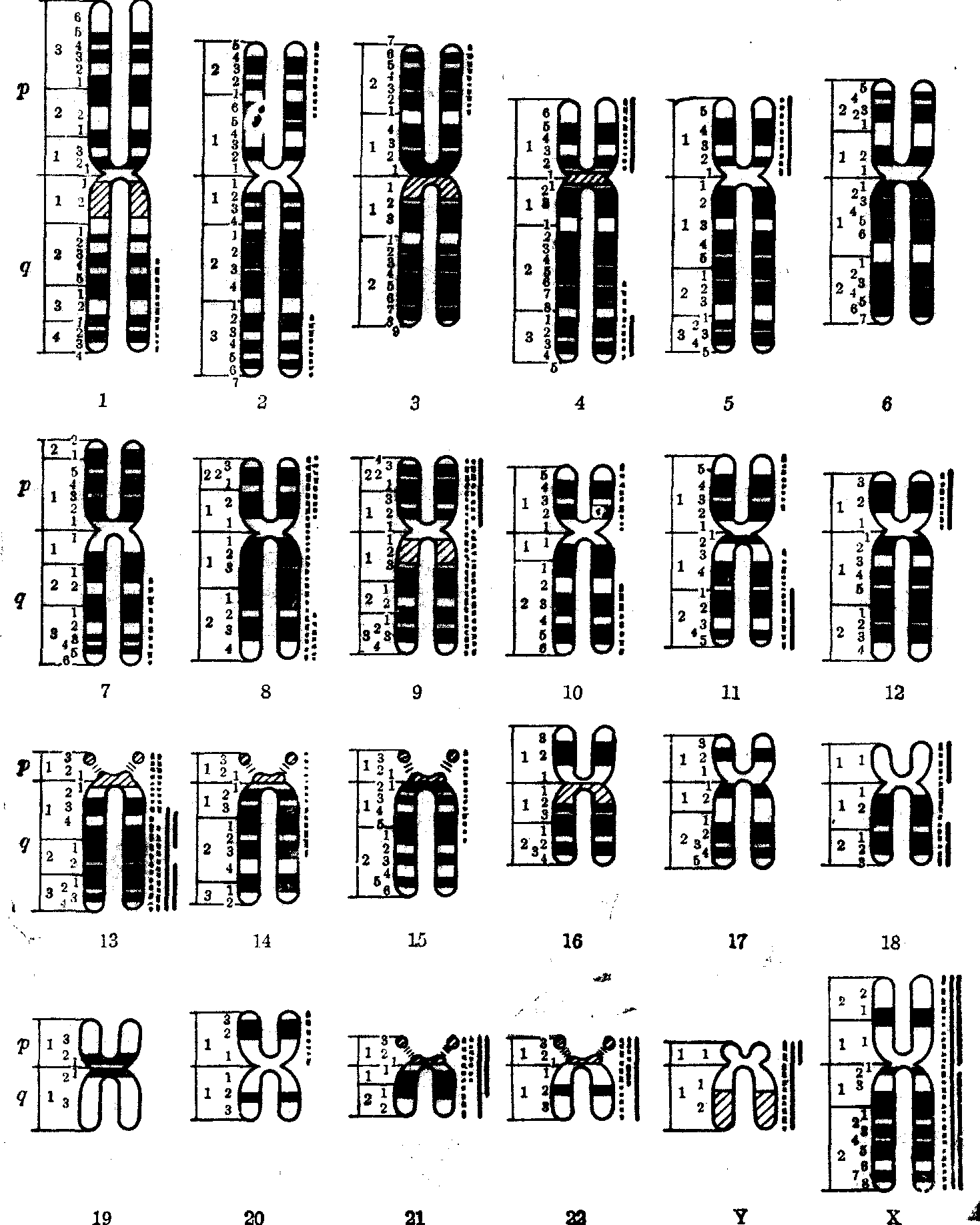 图2 正常人体细胞染色体G带带型 染色体显带技术有: ❶Q带: 用吖啶衍生物之类的荧光染料染色,在荧光显微镜下每条染色体均呈现特定顺序明暗相连的带纹。 ❷G带: 经一定程序处理后,用Gi-emsa染料染色所显示的带型,与Q带相同。 ❸R带:即反带,带型与G带相同,但深浅相反。 ❹C带: 对染色体着丝点(特别是1,9,16号染色体)和Y染色体长臂远端1 ![]() ❺T带: 又称端带, 使染色体末端部分着色较强。 ❻N带: 专对D和G组染色体的随体着色。 ❼高分辨带型: 分裂中期单套染色体G带可示320条带纹,高分辨技术可使染色体处于分裂早中期示546条带纹、前中期751条带纹、晚前期1,081条带纹,中前期2000条带纹。 染色体畸变有三种类型: (1) 形态结构异常:如缺失、倒位、重复、易位、环形染色体和等臂染色体等。 (2) 数目异常: ❶整倍的变化,如三倍体(69条)、四倍体(92条)等多倍体; ❷非整倍体,如增减一条或几条,少于46条者称亚二倍体,如先天性卵巢发育不全 (45,XO),多于46条者称超二倍体,如21-三体综合征 (47,+21)。 (3) 嵌合体:一个体内出现染色体核型不同的细胞群,如45,XO/46,XX。 目前已知的染色体畸变原因有: ❶母亲年龄过高时所育子女如三体综合征发生率增高,与卵细胞在母体内成熟分裂时间过长,易受体内外环境影响而发生染色体不分离性畸变有关。 ❷辐射: 如X射线,γ射线、中子流、紫外线、钚、氡-222等。 ❸感染: 如仙苔病毒、转移病毒、支原体等。 ❹化学品与药物类: 如长春碱、自力霉素等。 ❺家族遗传因素: 双亲之一为平衡易位携带者,可生育染色体异常的子代。 1959年以来,特别是70年代后,染色体显带技术应用于临床,使以染色体分析为主要方法和内容的人体细胞遗传学迅速发展,迄今已记载和报道过的染色体异常类型已达300种以上,其中部分可导致各种畸形及生长发育与智能障碍,形成多种不同的染色体异常综合征,例如三体综合征、部分三体综合征、部分单体综合征、嵌合体、多倍体等。严重者常引起流产或在新生儿期即夭折。据世界各地报道,染色体异常者在自发流产中占20~50%;活产新生儿中占4.53~8.34‰,其中半数为常染色体异常综合征,现择要列表于下。 染色体畸变性疾病常伴有多发性畸形,智能低下、生长发育落后等,患者不但不能自食其力,还给社会及家庭造成很大的负担及痛苦,但至今尚无有效治疗方法。目前国外有些较发达国家对35~40岁以上的孕妇进行产前染色体普查,以阻止患儿的出生; 国内也正在加强这方面工作。对刚出生的可疑患儿,应尽早检查、诊断。对已存活患者,应加强社会福利,将患者集中管理,按智能低下不同程度,安排适当简便劳动,有利于双亲为四化工作。对尚能生育,智能障碍不严重者应按优生学观点,加强婚前咨询及产前诊断,必要时,应劝阻其结婚。 常染色体异常临床综合征
