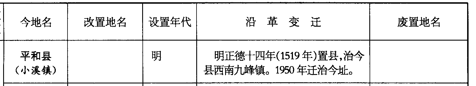 平和县(小溪镇)明明正德十四年(1519年)置县,治今县西南九峰镇。1950年迁治今址。