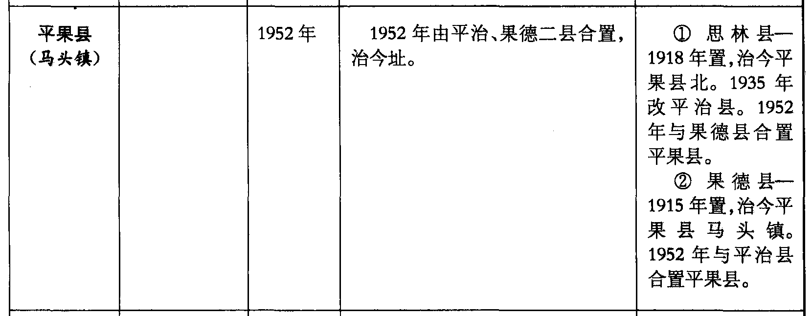 平果县(马头镇)1952年1952年由平治、果德二县合置,治今址。❶ 思林县—1918年置,治今平果县北。1935年改平治县。1952年与果德县合置平果县。❷ 果德县—1915年置,治今平果县马头镇。1952年与平治县合置平果县。