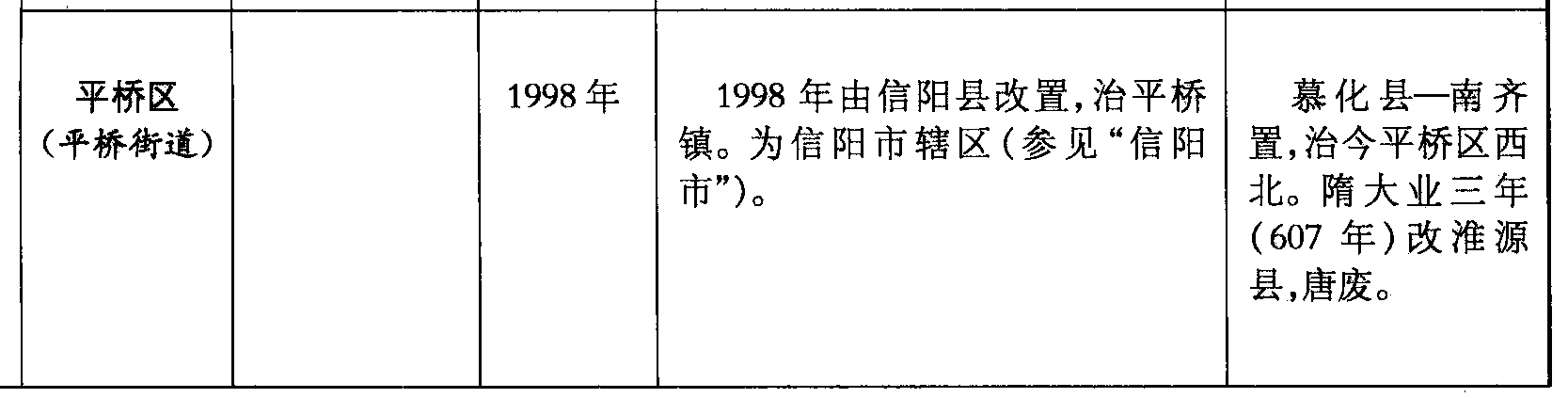 平桥区(平桥街道)1998年1998年由信阳县改置,治平桥镇。为信阳市辖区(参见“信阳市”)。慕化县—南齐置,治今平桥区西北。隋大业三年(607年)改淮源县,唐废。