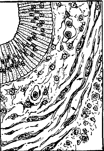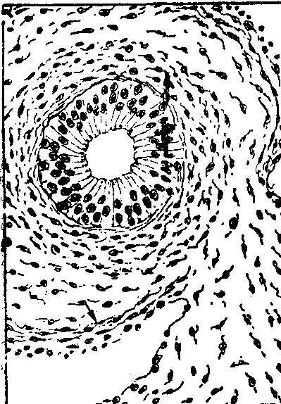 释义 | 平滑肌的发生 平滑肌的发生平滑肌主要来源于中胚层和间充质,可因所处地区而异(见表),消化系统和呼吸系统管壁的环肌、纵肌和粘膜肌均来自侧板的脏壁中胚层,大血管的肌层来自脏层或壁层中胚层,小血管的肌层来自散在的间充质细胞;泌尿生殖管道的肌层来自间介中胚层,即生肾节中胚层。此外,有少数平滑肌,如虹膜肌及包括汗腺在内的一些腺体管壁或腺泡周围的肌上皮细胞,不是来源于中胚层,而来自外胚层。平滑肌的来源尽管不同,但发生过程基本相同。在发育初期,游离的间充质细胞聚集到这些内脏器官的上皮管周围,细胞变长为梭形,核亦变长。按照成体时平滑肌的排列方式作环状或纵行排列,早期比较疏松,细胞分裂增生。开始具有合成收缩性蛋白质(肌动蛋白或肌球蛋白)时即分化成为成肌细胞(图1 ),以后成肌细胞产生成行排列的胞质颗粒,这些颗粒纵行串连形成肌原纤维。人胚小肠平滑肌的肌原纤维出现于6~7周,已具备平滑肌细胞的形态(图2)。到9周时,细胞体及核均伸长,分化成为平滑肌所特具的长梭形,肌原纤维继续增多。细胞间有由间充质来源的成纤维细胞,它们产生网状纤维和胶原纤维,缠绕着平滑肌,构成功能群。在早期平滑肌细胞发生过程中,除含有丰富的核朊粒外,胞质内有明显的粗面内质网和高尔基复合体。内质网池明显扩大。线粒体广泛分布于肌细胞内。平滑肌细胞间的连接,如紧密连接和缝隙连接,均出现于肌细胞发生的早期。人类的虹膜肌包括瞳孔括约肌和瞳孔张大肌,均来源于视杯神经外胚层。视杯前缘形成两层虹膜色素上皮,其前层细胞内产生肌原纤维,特化为平滑肌细胞,经芽生增殖,并脱离上皮而伸展到上皮表面的结缔组织内。被结缔组织及血管分隔成束,在第8月时发育成为瞳孔括约肌。瞳孔张大肌来自色素上皮前层的外侧部,胞质内产生肌原纤维而特化为平滑肌细胞。 平滑肌的胚层来源 图1 6周人胚,示平滑肌的发生(消化管)箭头指处为成肌细胞 图2 7周人胚成肌细胞已分化为平滑肌细胞箭头指处为平滑肌细胞 肌上皮细胞又称篮状细胞,分布于汗腺、乳腺、泪腺和唾液腺泡周围,是一种特殊的平滑肌。汗腺来源于上皮嵴构成的细胞索,7月时才开始出现管腔,腔壁里层细胞分化为腺细胞,周围的细胞则变成为扁平有突起的星状细胞,以后胞质内产生肌原纤维而分化成为肌上皮细胞的特殊平滑肌。其他腺体的肌上皮细胞发育情况与汗腺类似。 眼球睫状肌与竖毛肌都来源于中胚层的平滑肌,前者来自视杯周围中胚层,后者来自毛囊表皮细胞芽附近的中胚层真皮细胞。 ☚ 骨胳肌的异常发生 心肌的发生 ☛ |