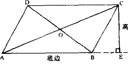 两组对边分别平行的四边形。如图,AB∥CD,AD∥BC,所以四边形ABCD是平行四边形。平行四边形用符号“”表示。例如, 平行四边形ABCD记作ABCD。在平行四边形中, 对边间的距离叫做平行四边形的高, 与高垂直的一边叫做平行四边形的底。例如图中AB是底,CE是高。平行四边形的性质是:❶两组对边分别相等,即AB=CD, BC=AD。❷两组对角分别相等, 即∠BAD=∠BCD, ∠ADC=∠ABC。❸相邻的两个角的和为180°, 即∠BAD+∠ADC=180°, ∠ABC+∠BCD=180°。❹两条对角线相互平分,即AO=CO,BO=DO。❺平行四边形是中心对称图形,对角线的交点O是平行四边形的对称中心。平行四边形容易变形, 利用它的不稳定性制成活动的放大尺、汽车的防护链等,在实践中有着广泛的应用。