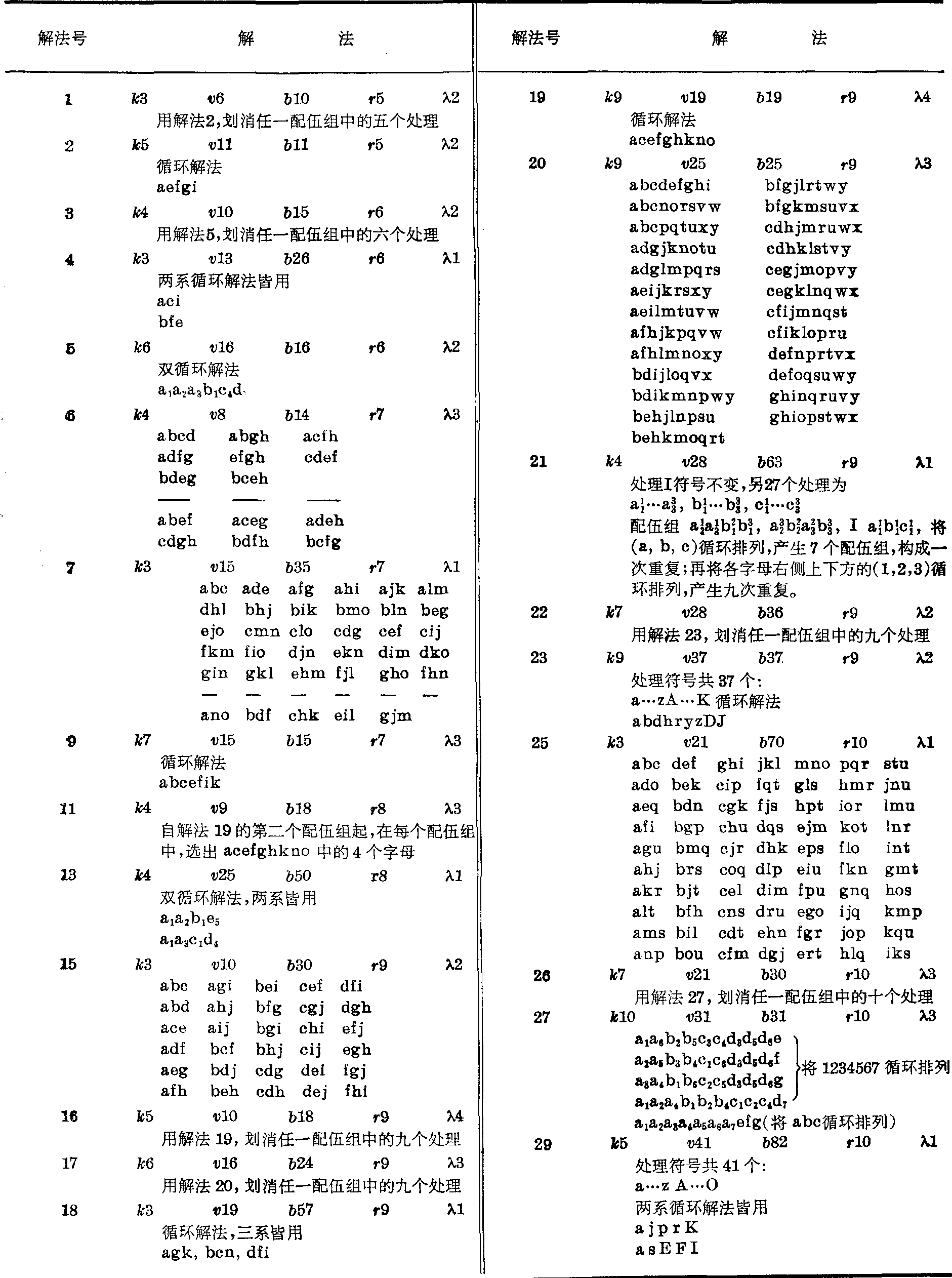 * 用解法2划消第3配伍组的五个处理解法2划消任一配伍组中的五个处理;两(或三)系皆用,指用两(或三)组字母循环,如解法4;双循环解法指先循环字母再循环数字,如解法5,v=b=16,r=k=6,循环的结果如下: