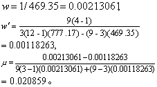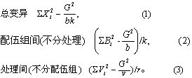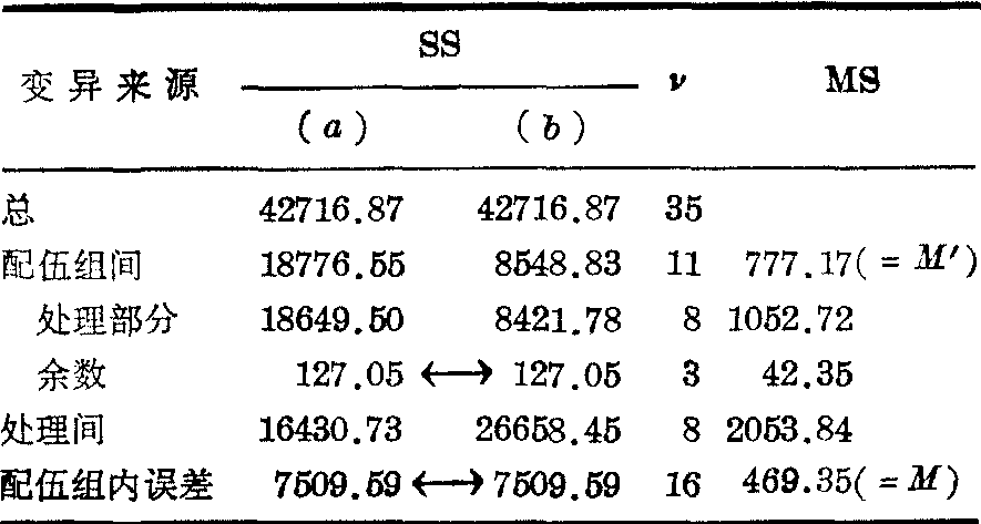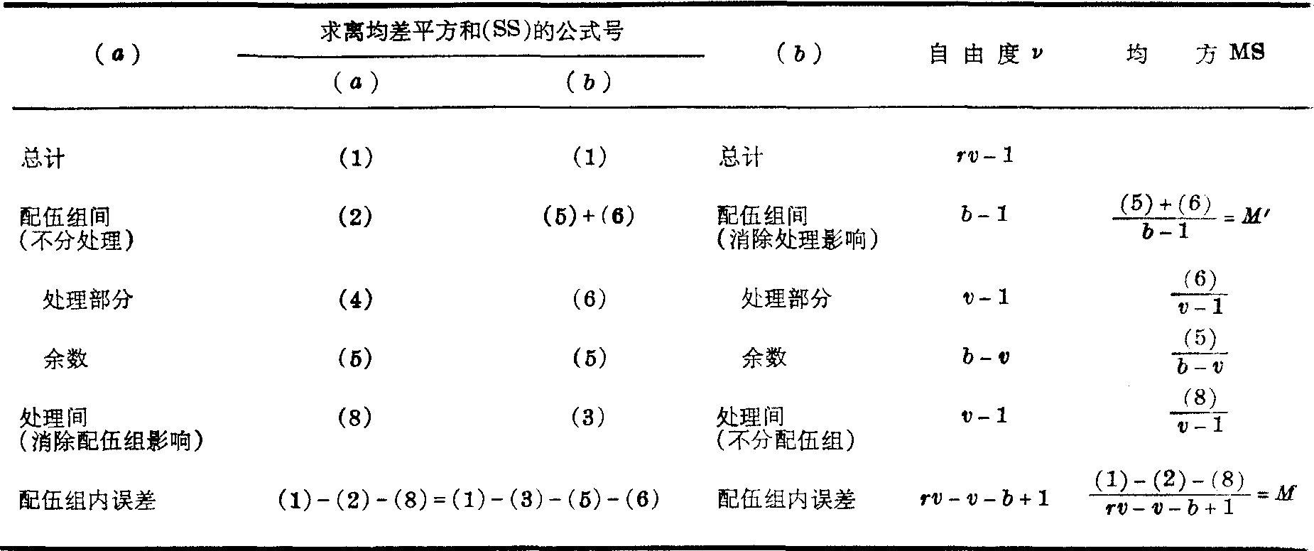 分析 在配伍组试验资料分析的基础上,把配伍组与处理间的相互影响分开,为此需求出消除配伍组影响的处理间均方及消除处理影响的配伍组间均方,并求出各处理的最有效估计值。计算步骤与公式如下: 令Xi为某一试验单位的结果,Bi为某一配伍组小计,Vi为某种处理所有结果合计,Ti为包含该处理的各配伍组小计之和,Ti'为其余各配伍组小计之和,G为所有实验结果之总和,b,v,r,k的意义同前。 方差分析见表5,该表分(a)、(b)两部分,由(a)可求得消除配伍组影响的处理间离均差平方和,由(b)可求得消除处理影响的配伍组间离均差平方和。表内列出了各部分计算时所用公式及某些项目间的关系。 表5 平衡不完全配伍组方差分析表 (1)先按配伍组试验资料分析方法,用式(1)~(3)求下列离均差平方和。 (2)为将配伍组与处理间的相互影响分开,再以式(4)~(11)求下列各离均差平方和。 配伍组间(不分处理)项内的 余数 式(2)-式(4)。(5) 配伍组间(消除处理影响)项则由 处理部分 ∑w2i/[rv(v-k) (k-1)] (6)与余数式(5)之和组成,即式(5)+式(6),式(6)中 wi=(v-k)Vi-(v-1)Ti+(k-1)G。(7)处理间(消除配伍组影响) ∑(kDi)2/(k2rE),(8)其中,kDi=kVi-Ti (9)是配伍组内处理的相差,当k>v/2时,用 kDi'=kVi十Ti'。(10) E为有效因子, 在配伍组试验中k=v,则E=1;当k M为配伍组内误差均方,M′为配伍组间均方; (4) 必要时可按多个样本均数间两两比较的方法(见条目“多个样本均数间两两比较”)比较各Ŷi值间的两两相差,或按资料情况作其他分析。 例 用大白鼠做实验,拟设9种处理(v=9)并各给代号:a正常对照,以照射量为500R的x线照射后o1小时,c5小时,d12小时,e1天,f 3天,g7天,h 10天,s 14天;然后杀死,作血浆皮质酮含量(μg/dl)检查。每周只能做三种处理(k=3),每种处理用3只动物构成一实验单位。 (1)设计。按k=3,v=9,查表1得b=12,r=4,以a,o,c,d,e,f,g,h,s代表九种处理,用正交方经随机化后安排试验,得结果(系同一处理作为一个实验单位的三鼠结果合计)如下: