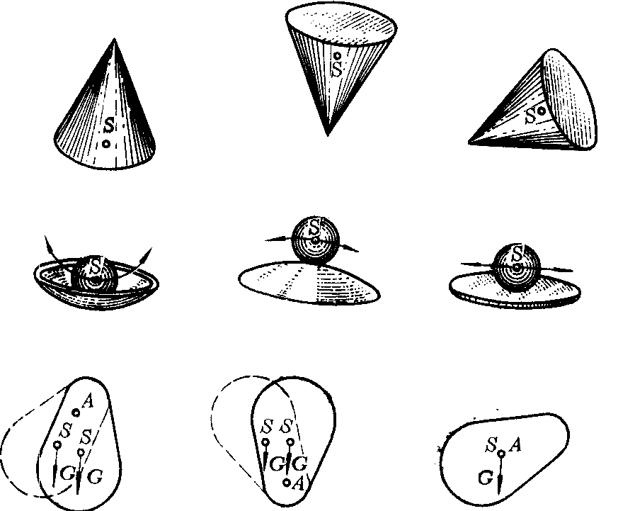 释义 | 平衡种类 平衡种类pingheng zhonglei刚体(或质点)受到多个外力作用时,当外力的合力为零,相对于某一点的合力矩为零时,称此刚体(或质点)处于平衡状态。平衡一般分为稳定平衡、不稳定平衡、随遇平衡三种。处在平衡状态下的物体受到微小扰动偏离平衡状态后,能自动恢复原状态则为稳定平衡;若不能恢复原状态,远离此态而达到一个新态时,称原平衡状态为不稳定平衡;若扰动后不恢复原态、也不远离原态,在任意状态下都能保持平衡时,称为随遇平衡。对于质点系统在保守力作用下的平衡问题较简单,在选定势能零点后,质点所在平衡位置上有势能值Ep,受到微小扰动后,势能也将发生变化,若平衡位置所具有势能均小于受扰动所能达到位置上的势能,即势能具有极小值,则为稳定平衡,若平衡位置势能均大于受扰动所能达到位置具有的势能,则为不稳定平衡;若势能受扰动后不改变则为随遇平衡。通常研究地球上静止物体的平衡问题,按对质点问题的分析,可知受扰动后重心升高的为稳定平衡,重心降低的为不稳定平衡,重心不变的为随遇平衡。如图1所示。 图 1 研究平衡的不同种类有现实意义: ❶扰动的种类不同,同一物体的平衡状态稳定性不同。对一汽车在水平路面上受水平方向微小扰动,令其平动,则为随遇平衡,在任何位置上都可平衡;对于使汽车翻转的微小扰动如一砖石支起车身,扰动撤消后,恢复原来状态,汽车状态为稳定平衡。 ❷扰动路径不同,平衡的种类可能不同,在如图2所示的势场内运动的质点(可想象成如图状的山坡中一个小球在运动)A、B、C三处均为平衡位置,B处小球受到任何扰动均远离此态,为不稳定平衡,A处小球受任何拢动均恢复原状,为稳定平衡,C处小球若受aa′方向扰动可以恢复原态,而受其它方向扰动均会远离原态,一般也称为不稳定平衡,但对仅能受aa′方向扰动时,又为稳定平衡。 ❸外力扰动对不同平衡有不同的作用,如平衡位置上的单摆受任何小扰动指受外力使之偏离平衡位置,扰动时间可任意长,扰动取消后,小球回到平衡位置。而对于绕质心转动的刚体如陀螺仪,处于平衡状态时,受到数值较大,但时间极短的冲力作用,仍能保持原来运动状态,用来在航海、航空中受到扰动仍能指示确定的方向,但若受到一小常力的作用,只要时间足够长,将会使平衡状态发生破坏,出现进动。 ❹平衡种类的分析是个较复杂的实际问题。一般关于物体在重力场中静止状态的平衡问题,运用重力势能、重心等概念分析清楚。其它问题必须针对具体问题分析,特别要分析扰动的大小、种类及特点。 图 2 ☚ 稳度 稳定平衡 ☛ |