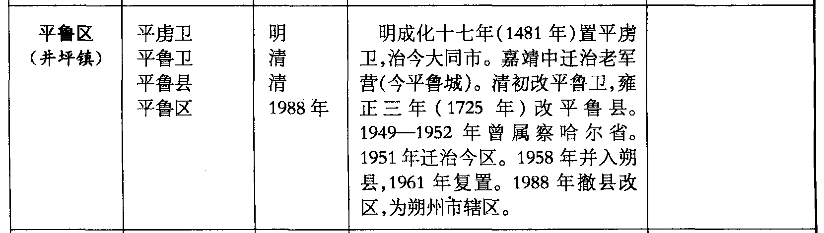 平鲁区(井坪镇)平虏卫平鲁卫平鲁县平鲁区明清清1988年明成化十七年(1481年)置平虏卫,治今大同市。嘉靖中迁治老军营(今平鲁城)。清初改平鲁卫,雍正三年(1725年)改平鲁县。1949—1952年曾属察哈尔省。1951年迁治今区。1958年并入朔县,1961年复置。1988年撤县改区,为朔州市辖区。