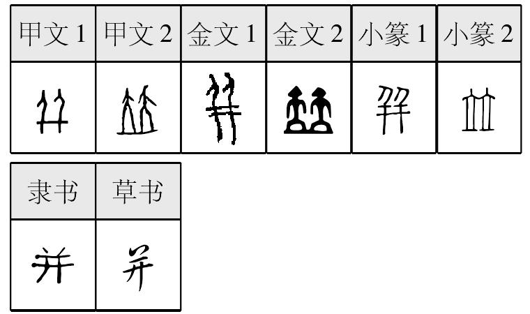 并,表意,甲骨文1、金文1、小篆1象二人并排而立之形,人的腿部用一条或两条横线连结,本义读bìnɡ,并列、并连,引申为合并、兼并、副词(表示不同的事物同时存在或进行)等;又读bīnɡ,用于地名,山西太原的别称,得名于古地名并州。並,又作“竝”,表意,甲骨文2、金文2、小篆2象二人并排而立之形,读bìnɡ,本义表示并列、并排挨着,引申为合并等。併,形声,从人,并声,读bìnɡ,本义为并列、并行,引申为合并、兼并等。这四个字基本意义很接近,《异体字表》以“並、竝、併”为异体字。 【辨析】 ❶“并”与“並(竝)”“併”不是等义异体字。 ❷在古汉语中,“并”“併”与“並(竝)”同义不同音。习惯用法也稍有差异:一般说来,用于动词,表示合并、兼并义,多写“并”或“併”;用于形容词,表示并列、并连义,多写“並”;用于副词,表示同时、一齐,多写“並”;用于连词,相当于“并且”,多写“並”;用于地名,只能用“并”。它们古代读音不尽相同:“并”“併”是清声母,“並(竝)”是浊声母,音韵学声纽代表字“帮滂並明”不作“并”。 ❸以“并”作音符构成的形声字读音不同。bǐnɡ:饼∣pínɡ:瓶∣pīn:拼、姘∣pián:骈、胼∣bènɡ:迸。 【构词】 并存(并存∕並存)∣并驾齐驱(并駕齊驅∕並駕齊驅)∣并联(并聯∕並聯)∣并列(并列∕並列)∣并发症(併發症)∣并轨(併軌)∣并肩(併肩)∣并拢(併攏)∣归并(歸併)∣合并(合併)∣火并(火併)∣兼并(兼併)∣吞并(吞併)∣并州(并州)并 ☚ 糸 名 ☛ 00000442 |