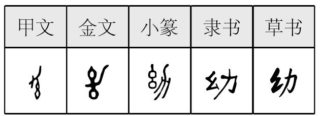 幼幼,甲骨文作 ,金文作 ,小篆作 。 甲骨文从力从幺,玄亦聲。構形意義難以確定,若説 “力小爲幼” 終覺勉强,姑存疑以待達人。金文或从幽从子,幽亦聲。“幽”含微小之義,从幽从子會意,猶言小子,當是重構寓意。卜辭疑用作祭名。銘文或指小孩、少年。文獻多用幼小等義。又或讀如 “窈”,幽深、幽暗之義。 楚簡帛文作 ,前者沿襲古體,後者可以認爲是金文第二字形的“行書化”。秦簡牘文作 ,古意猶存。參見435.幽字條。 幼yòu(5画)