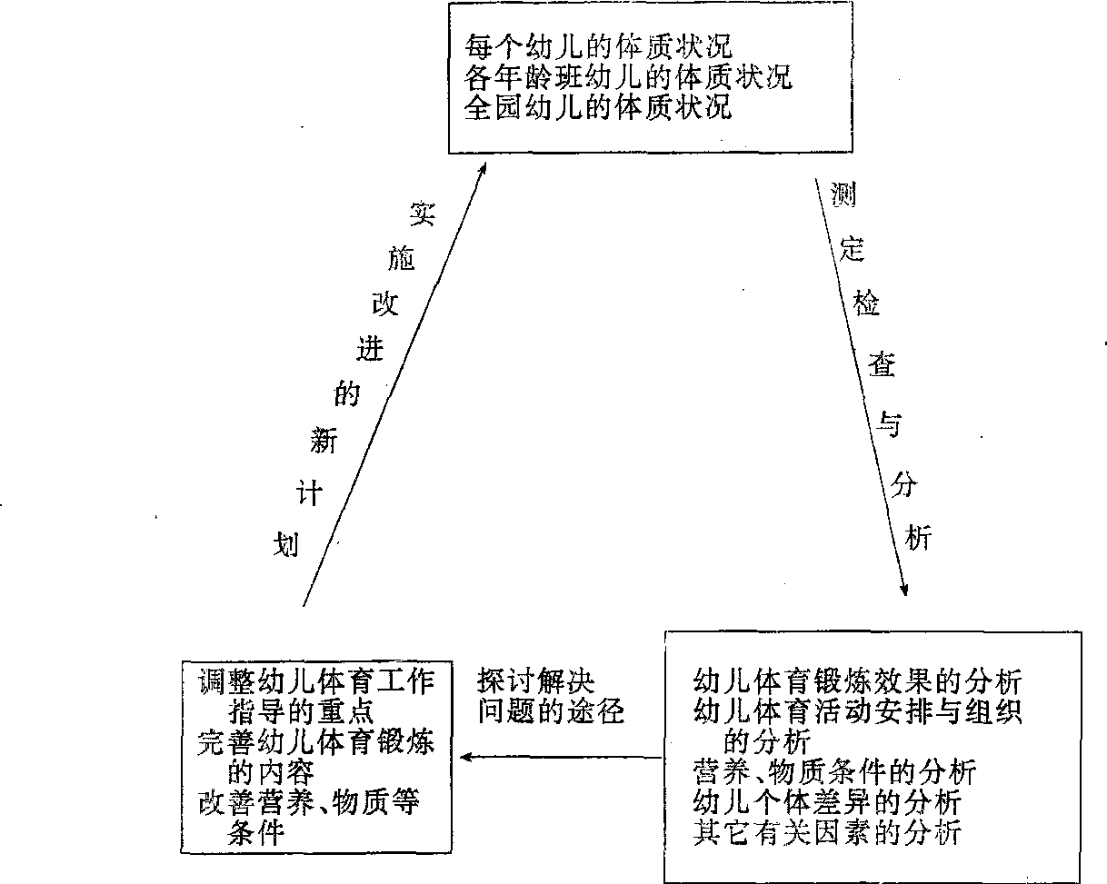 对幼儿进行定期的体质测定与评价,可以了解和掌握幼儿体质的发展现状及其发展变化的趋势、规律,更好地检查和评定幼儿体育工作以及增强幼儿体质的实效,以此分析、研究影响幼儿体质强弱的各种因素,并从加强科学的体育活动与身体锻炼、改善营养和卫生条件等方面出发,及时采取相应的措施,以便更加有效地增强幼儿的体质。幼儿体质的测定与评价工作,是研究幼儿体质状况的两个紧密相连的环节。幼儿体质测定与评价的整个过程,可以从下列图示中反映出来。深入开展幼儿体质的测定与评价工作,加强幼儿体质的调查研究,也是增强整个中华民族的体质、提高人口素质的一项重要措施。