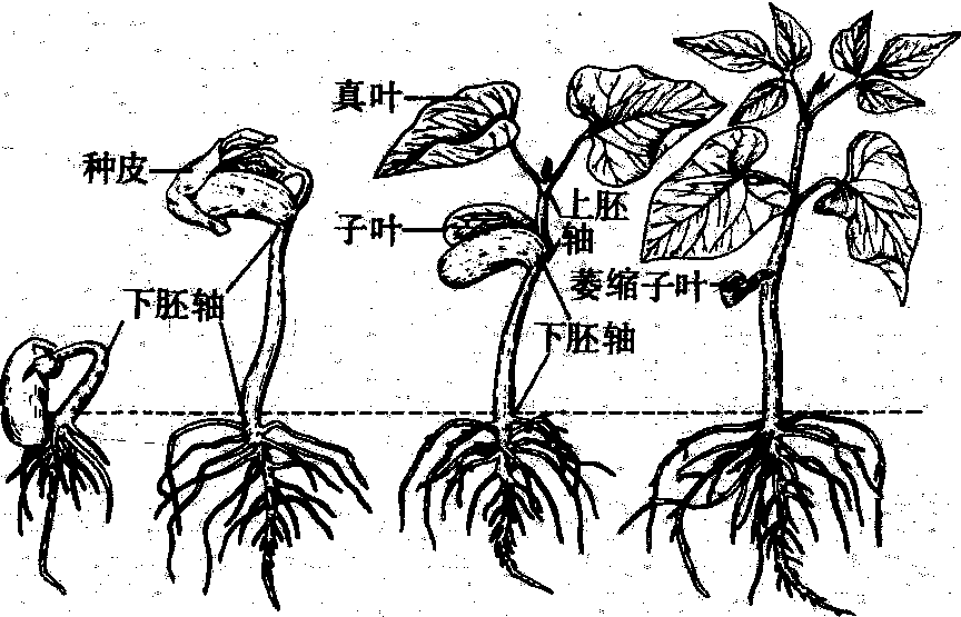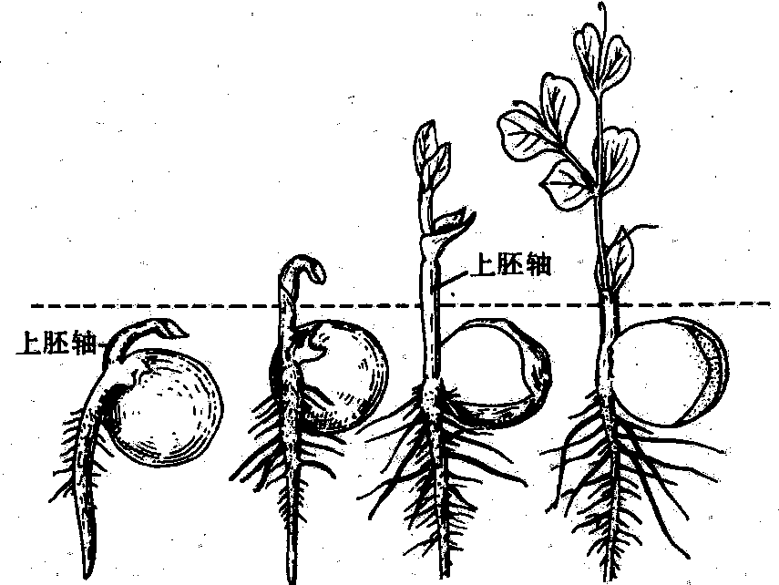 释义 | 幼苗yòumiáo幼小的植物(如禾苗、树苗等) 幼苗seedling由种子的胚发育而来的,包括通过营养繁殖、组织培养所长成的幼小植株统称为幼苗。幼苗的主根是由种子的胚根发育形成,以后从主根上长出数级侧根,形成幼苗的地下根系。幼苗的地上部分——茎和叶,由胚芽生长发育而来。 图 1 子叶出土幼苗(蓖麻) 子叶留土的幼苗 种子萌发时,仅子叶以上的胚轴伸长生长,形成植物的地上茎、叶系统。下胚轴不伸长,子叶留在土中。子叶内所贮藏的养料供给正在发育的胚芽、胚根应用,最后子叶因养料耗竭而解体,如蚕豆、豌豆的幼苗(图2)。水稻、小麦、玉米等也由于下胚轴不伸长,形成子叶留土的幼苗。 幼苗的鉴别 种子植物幼苗的形成规律及形态特征常随植物种类而有不同,这对于植物识别与分类以及杂草防除等都有意义。鉴别幼苗的依据主要有下列诸方面。 胚轴的长短 除下胚轴伸长与否外,上胚轴伸长与否也是比较稳定的特征。十字花科、伞形科、毛茛科和报春花科等的许多种类,在幼苗期其上胚轴都是不伸长的,幼苗呈莲座状,大车前的叶片能直接从两片子叶之间长出来,藜、繁缕等的上胚轴则明显伸长。上胚轴毛的有无 旱莲草、水苋等的上胚轴有毛,而鹅不食草的上胚轴则无毛。
