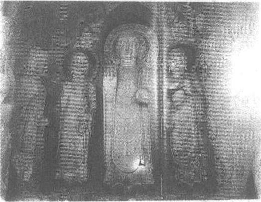 初唐。主尊接引佛高5.1米,两身菩萨高约4.4米。四川省广元市皇泽寺第10号大佛窟。窟高7米,宽5.8米,是皇泽寺最大的石窟。身高4米以上的造像就有五尊,另有浮雕天龙八部及武士。此窟作品是皇泽寺造像发展到高峰的产物,为我国初唐石窟造像的优秀范例。主尊接引佛立于莲座之上,右手作施无畏印,左手托一小盒。着通肩袈裟,胸前系一吉祥花结,衣纹规矩富于装饰性。佛的面相丰圆,下颌微上翘,气度不凡。两旁的弟子虔诚肃穆。两身胁侍菩萨面颐丰满,露出娴雅的微笑,给人以亲切之感。宝冠的装饰、耳饰、璎珞均十分精致。璎珞垂于膝下,再佩以项圈、花腰带,显示出装扮的华丽和高贵。长裙的衣纹飘洒自然。此两尊菩萨像是皇泽寺摩崖造像的精致之作。此窟的力士,天王像也颇为雄健。