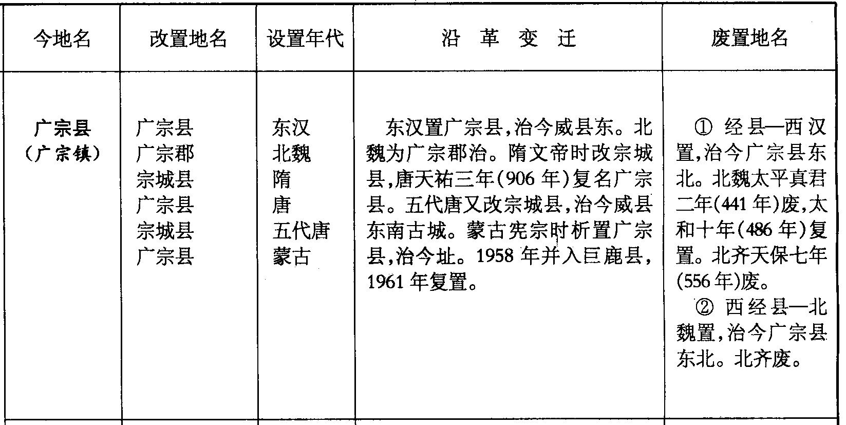 广宗县(广宗镇)广宗县广宗郡宗城县广宗县宗城县广宗县东汉北魏隋唐五代唐蒙古东汉置广宗县,治今威县东。北魏为广宗郡治。隋文帝时改宗城县,唐天祐三年(906年)复名广宗县。五代唐又改宗城县,治今威县东南古城。蒙古宪宗时析置广宗县,治今址。1958年并入巨鹿县,1961年复置。❶ 经县—西汉置,治今广宗县东北。北魏太平真君二年(441年)废,太和十年(486年)复置。北齐天保七年(556年)废。❷ 西经县—北魏置,治今广宗县东北。北齐废。