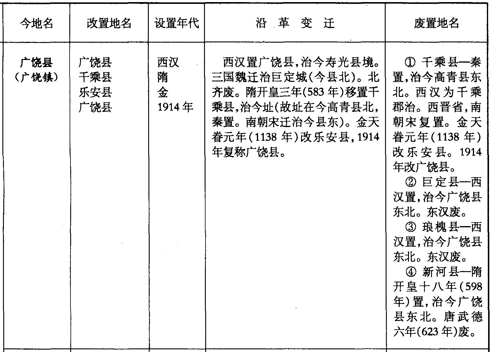 广饶县(广饶镇)广饶县千乘县乐安县广饶县西汉隋金1914年西汉置广饶县,治今寿光县境。三国魏迁治巨定城(今县北)。北齐废。隋开皇三年(583年)移置千乘县,治今址(故址在今高青县北,秦置。南朝宋迁治今县东)。金天眷元年(1138年)改乐安县,1914年复称广饶县。❶ 千乘县—秦置,治今高青县东北。西汉为千乘郡治。西晋省,南朝宋复置。金天眷元年(1138年)改乐安县。1914年改广饶县。❷ 巨定县—西汉置,治今广饶县东北。东汉废。❸ 琅槐县—西汉置,治今广饶县东北。东汉废。❹ 新河县—隋开皇十八年(598年)置,治今广饶县东北。唐武德六年(623年)废。