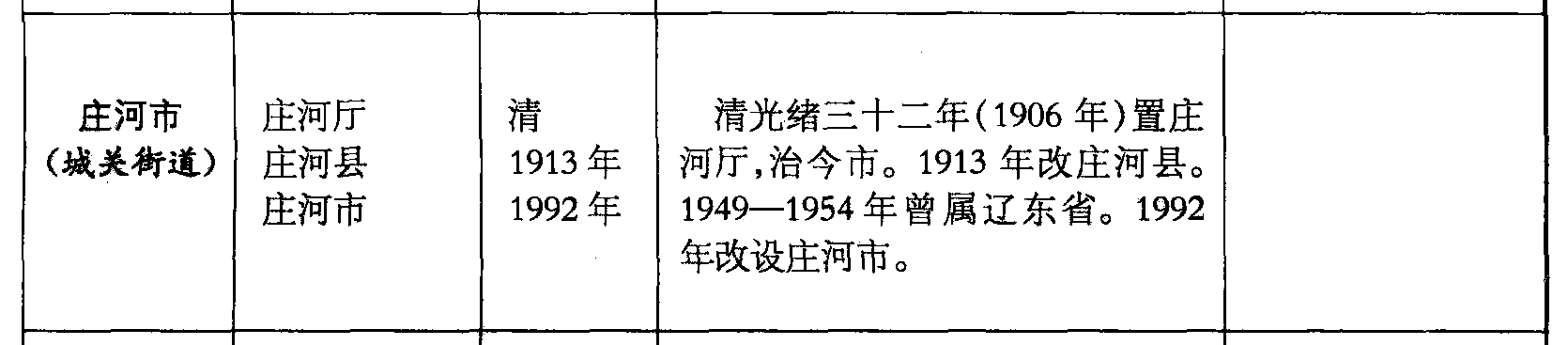 庄河市(城关街道)庄河厅庄河县庄河市清1913年1992年清光绪三十二年(1906年)置庄河厅,治今市。1913年改庄河县。1949—1954年曾属辽东省。1992年改设庄河市。