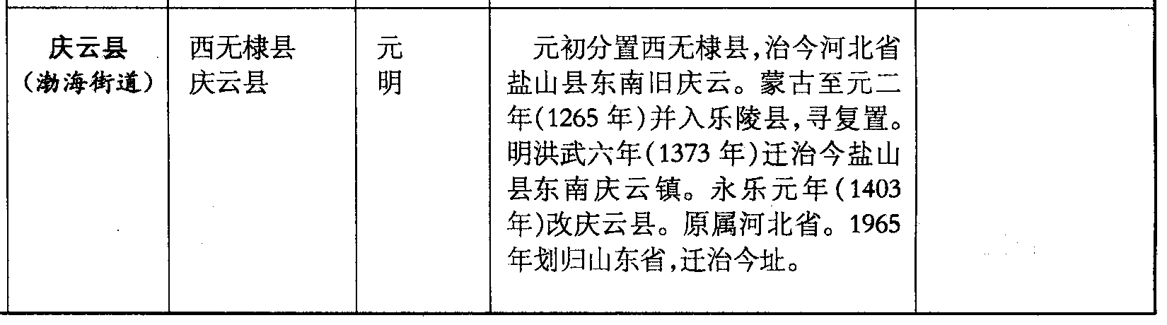 庆云县(渤海街道)西无棣县庆云县元明元初分置西无棣县,治今河北省盐山县东南旧庆云。蒙古至元二年(1265年)并入乐陵县,寻复置。明洪武六年(1373年)迁治今盐山县东南庆云镇。永乐元年(1403年)改庆云县。原属河北省。1965年划归山东省,迁治今址。