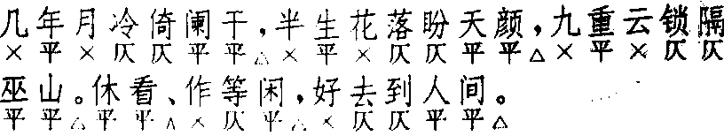 释义 | 庆元贞 庆元贞顾君泽 小令 ![]() 全曲五句:7△,7△,7△。2△,3△,5△。首三句平仄一律。末二句均为五字句,而上句藏韵,成为定格。吴仁卿“天气融融”套,《阳春白雪》本“欢喜、无尽期”,本藏韵;《雍熙乐府》作“君臣同乐矣”,则不藏韵,仅见。小令兼用。说明见〔黄蔷薇〕,两章必须连用。吴仁卿“天气融融”套题〔庆元贞〕及〔幺〕,无名氏“万国来朝”(载《盛世新声》、《词林摘艳》)套只题〔庆元贞〕,实皆两曲连用。亦有只题〔黄蔷薇〕者,同误。 ☚ 黄蔷薇 寨儿令 ☛ |