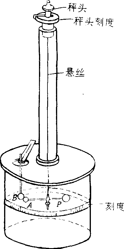释义 | 库仑扭秤 库仑扭秤kulun niucheng库仑设计的用以直接测定两个静止点电荷的相互作用力的实验装置。扭秤的结构如下图,悬丝与秤头固定,秤头可带动悬丝转动,其转角β可由秤头刻度读出。在悬丝下端挂一横杆,杆的一端有一小球A,另一端有一平衡物P,横杆可带悬丝绕悬丝轴转动,其转角α可由大圆筒外的刻度读出。A的旁边还有一固定小球B。令A、B带同性电荷,A因受B的斥力而转过一定角度,直至悬丝的扭力矩与A所受的静电力矩平衡为止。设此时读数为α1,相应的A、B之间的距离为γ1。由悬丝扭角可测知点电荷A、B之间的静电力。为测得静电力与距离的关系,需要在不改变A、B各自所带电量的前提下改变A、B之间的距离。为此让秤头沿相反方向扭转悬丝,使球A重新向B球靠近,例如使得A球与B球的距离γ2=γ1/2。读出此时秤头反向转过的角度β2(由秤头刻度读出)和横杆正向转过的角度α2。A、B球相距γ2时的静电力可由此时悬丝扭转的角度α2+β2而获得,即悬丝扭角ᵠ为横杆正向转角α与秤头反向转角β之和。当γ=γ1时,β1=0,ᵠ1=α1+β1=α1;当γ=γ2=γ1/2时,ᵠ2=α2+β2。库仑的原始实验数据如下表所示: