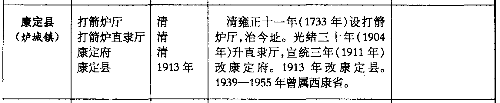 康定县(城镇)打箭炉厅打箭炉直隶厅康定府康定县清清清1913年清雍正十一年(1733年)设打箭炉厅,治今址。光绪三十年(1904年)升直隶厅,宣统三年(1911年)改康定府。1913年改康定县。1939—1955年曾属西康省。