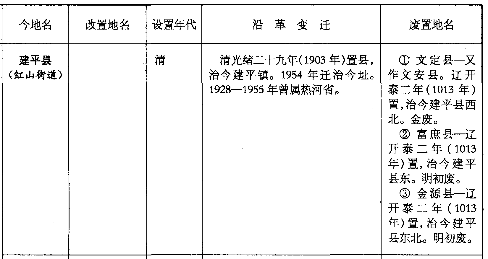 建平县(红山街道)清清光绪二十九年(1903年)置县,治今建平镇。1954年迁治今址。1928—1955年曾属热河省。❶ 文定县—又作文安县。辽开泰二年(1013年)置,治今建平县西北。金废。❷ 富庶县—辽开泰二年(1013年)置,治今建平县东。明初废。❸ 金源县—辽开泰二年(1013年)置,治今建平县东北。明初废。喀喇沁左翼
