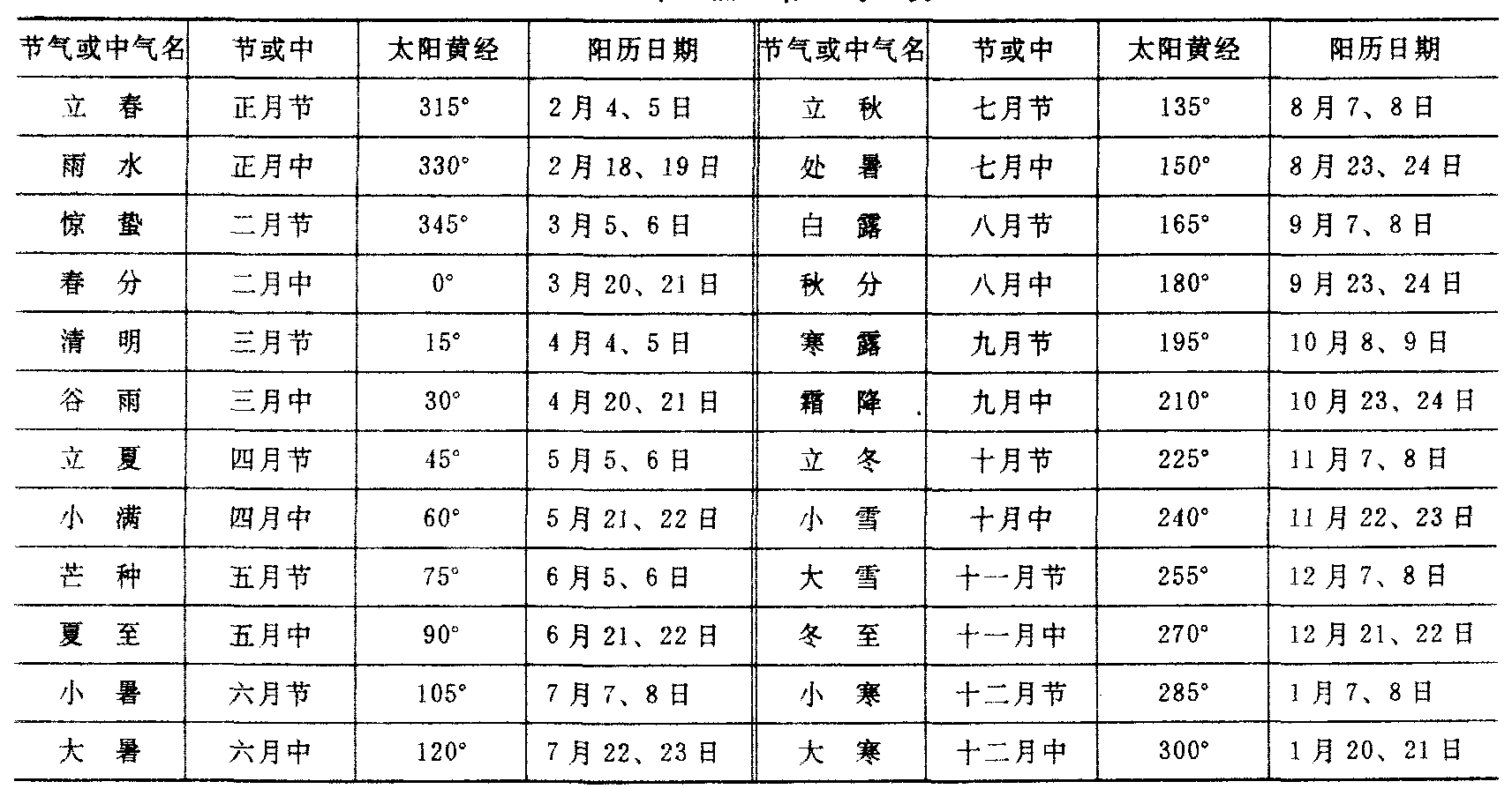 释义 | 廿四节气 010 廿四节气中国传统农历的一部分,十二个中气和十二个节气的总称。约自战国时代起,古人即将太阳周年视运动轨道上的24个特定的点依次命名为: 冬至、小寒、大寒、立春、雨水、惊蛰、春分、清明、谷雨、立夏、小满、芒种、夏至、小暑、大暑、立秋、处暑、白露、秋分、寒露、霜降、立冬、小雪、大雪。这是中国古代的独特创造,在《淮南子·天文训》中已有完整记载。它们与阳历相对应,上半年逢每月6日、21日前后,下半年为8日、23日前后,相差不过一、二日。其顺序为单数的,称作十二个中气;为偶数的,称作十二个节气。我国传统按四立将一年划为春、夏、秋、冬四季。立春为春之始,为第一气。廿四节气能较稳定、准确地反映一年中气温、日照及雨量变化的规律,对农业生产起着重要的指导作用。为便于记忆,人们编有二十四节气歌如下:春雨惊春清谷天,夏满芒夏暑相连;秋处露秋寒霜降,冬雪雪冬小大寒。 ☚ 气 历元 ☛ 廿四节气 廿四节气ershisi jieqi在历法中安排有二十四节气来报道气候的演变,是为了把农时和季节联系起来,以便指导农业生产而设立的。把二十四节气和阴阳历联系使用,在我国已有二千多年,所以常把阴阳历称为农历。实际上,二十四节气的设立有其明确的天文意义,它来源于太阳的周年运动,是属于阳历范畴之内,节气的安排以太阳的黄经为依据,每隔15°一气,一回归年共分二十四节气。从春分点开始,太阳在春分点时为春分,黄经是0°,随着太阳在黄道上运行,节气和中气相间排列,可以得到12个节气,12个中中气。由于太阳在黄道上运行速度不均匀,前进15°所用时间不同,因而两气相隔时间不同。下表列出节气和中气时太阳的黄经和阳历的时间: 二 十 四 节 气 表 ☚ 历法 四季 ☛ 廿四节气 廿四节气niàn sì jié qì24 Solar Terms白露 [bái lù] White Dew (15th solar term) ☚ 生日星座 时间一般用语 ☛ |