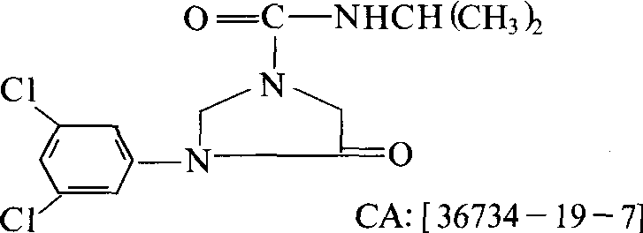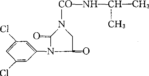 异菌脲iprodione又名朴海因、咪唑霉。二甲酰亚胺类杀菌剂。化学名称:3-(3,5-二氯苯基)-N-(1-甲基乙基)-2,4-二氧-1-咪唑啉甲酰胺。化学结构式如下。原药无色结晶,20℃溶解度,水中13 mg/L,乙醇、甲醇25 g/L,丙酮、苯甲醚300 g/L,二甲基甲酰胺、二氯甲烷500 g/L。一般稳定,无腐蚀性。1971年法国罗纳-普朗克公司推广。广谱保护性杀菌剂,对葡萄孢菌,丛梗孢菌,小核菌属有特效。对交链孢菌、长蠕孢菌、丝核菌、镰刀菌、茎点属菌、伏革菌、核瑚菌亦有效,抑制孢子萌发和菌丝生长,种子处理和叶面喷洒、烟剂熏蒸,及水果果实防腐,用于果树、蔬菜、花卉及谷物的多种病害。对植物安全,大鼠急性口服LD503500 mg/kg,经皮2500 mg/kg,慢性中毒试验未发现中毒反应,对蜜蜂无毒。 |