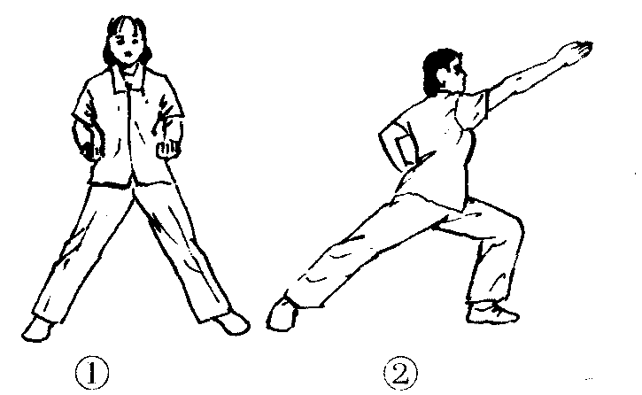练功十八法第2套第5节。动作过程:直立分腿一大步,两手握拳收于腰间。(图2—4—131—❶)❶上体左转成左弓步,同时右拳变掌向前上方插掌,掌心向侧。(图2—4—131—❷)❷还原成预备姿势。❸❹动作与❶❷相同,但方向相反。共做4个8拍。注意事项:弓步插掌时要注意腰、腿、臂三直。此功法对于腰背、四肢酸痛、麻木有一定疗效。