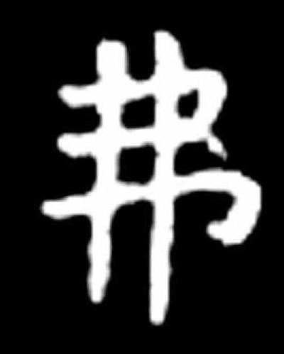 ❷ 罚弗及嗣 弗fú (甲) (篆) 会意字,由“弓”与两“丨”构成。两“丨”,是矫正“弓”的工具。一说为象形字。甲骨文字形中间两“丨”似不平直,以绳索束缚,使之平直。《说文》:“弗,矫也。”徐灏注:“弗与弼音义同。凡弛弓,则以两弓相背而缚之,以正枉戾,所谓矫也。”现本义已失,被借作为否定词。作声符生成的字有: fú 拂(拂晓) 怫(怫郁) 绋(特指牵灵柩的大绳) 佛(仿佛) 氟(气体元素) 砩(砩石,一种矿物,即萤石) fèi 费(消费) 沸(沸腾) 狒(狒狒,猴子中的一种) 镄(金属元素) fó 佛(佛教)