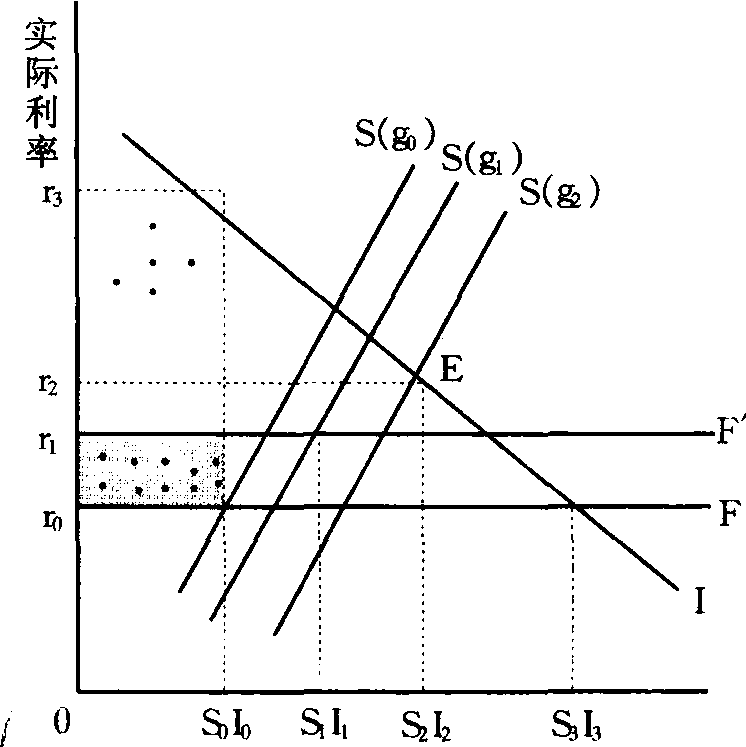 弗莱的金融深化图解描述美国加里福尼亚大学教授M·弗莱用图形说明麦金农和肖关于放松金融压制,提高利率,刺激储蓄和投资,促进经济增长的观点。 弗莱主要是用图形对提高利率刺激储蓄和投资的金融深化要点进行了清楚的说明。如图5-5所示,s (g0)、s (g1)和s (g2)分别表示经济增长率为g0、g1和g2时的储蓄水平; I表示投资; F和F′表示金融压制,指政府人为地压低实际利率,在图5-5中表现为r0和r1。如果存款利率为r0,则储蓄为S0,投资供给为I0。但人们的投资需求却为I3,I3-I0便是投资资金供求的缺口,如果不限制贷款利率,则贷款利率会升至r3,但事实上,政府通常也将贷款利率限制在r0。结果,投资资金的供不应求造成了配给制,并导致低效益的投资 (图16-25中阴影部分)。如果把利率提高到r1,一方面,储蓄和投资分别上升到S1和I1; 另一方面,贷款利率的上升会阻止低效益的投资,增加高效益投资。这样,投资平均效率的提高促使经济增长率上升到g1。如果进一步提高利率,取消金融压制,或有效地降低了通货膨胀率。储蓄和投资将进一步增加,经济增长率会继续上升到g2。当利率提高到r2时,储蓄为OS2,投资为OI2,经济处于均衡量状态。 弗莱的金融深化图解描述 弗莱的金融深化图解描述financial deepening model ofFry美国加里福尼亚大学教授M·弗莱用图形说明麦金农和肖关于放松金融压制,提高利率,刺激储蓄和投资,促进经济增长的观点。 弗莱主要是用图形对提高利率刺激储蓄和投资的金融深化要点进行了清楚的说明。如图16-25所示,s(g0)、s(g1)和s(g2)分别表示经济增长率为g0、g1和g2时的储蓄水平;I表示投资,F和F′表示金融压制,指政府人为地压低实际利率,在图16-25中表现为r0和r1。如果存款利率为r0,则储蓄为S0,投资供给为I0。但人们的投资需求却为I3,I3—I0便是投资资金供求的缺口,如果不限制贷款利率,则贷款利率会升至r3,但事实上,政府通常也将贷款利率限制在r0。结果,投资资金的供不应求造成了配给制,并导致低效益的投资(图16-25中阴影部分)。如果把利率提高到r1,一方面,储蓄和投资分别上升到s1和I1;另一方面,贷款利率的上升会阻止低效益的投资,增加高效益投资。这样,投资平均效率的提高促使经济增长率上升到g1。如果进一步提高利率,取销金融压制,或有效地降低了通货膨胀率。储蓄和投资将进一步增加,经济增长率会继续上升到g2。如图16-25所示,当利率提高到r2时,储蓄为OS2,投资为OI2,经济处于均衡量状态。