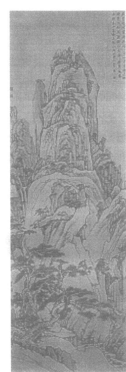 立轴,纸本,水墨。天都峰是黄山最险峻的山峰。作者用转折刚劲的墨笔空勾出一个个如几何体般棱角突出的山石巨岩,造成天都峰奇绝险峻之势。画面中天都峰凛然独立。山下岩石体积较大,越高处岩石体积减小,错落而置,有直插云端之感。山谷中瀑布飞泻,山岩间奇松挺秀。山脚一棵古松盘郁茂密,显出不屈不挠的生命力。山石纯用浓墨枯笔勾写,于转折叠压处略作皴染,使山石颇具体量感。松木、小枝用笔沉着稳定,严谨精细。画面呈现出简洁、瘦劲、宁静、幽深之美。