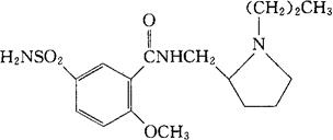 释义 | 丙舒必利 C16H25N3O4S=355.45 CAS-68556-59-2 N-[(1-丙基-2-吡咯烷基)甲基]-5-氨磺酰-邻-茴香酰胺。 N-[(1-Propyl-2-pyrrolidinyl)methyl]-5-sulfamoyl-oanisamide. 5-(氨磺酰)-2-甲氧-N-[(1-丙基-2-吡咯烷基)甲基]苯甲酰胺。 5-(Aminosulfonyl)-2-methoxy-N-[(1-propyl-(2-pyrrolidinyl)methyl]benzamide. 抗精神病药。 普舒必利。 Prosulpride,Cesapral,GRI 1665. INN,USAN. |
