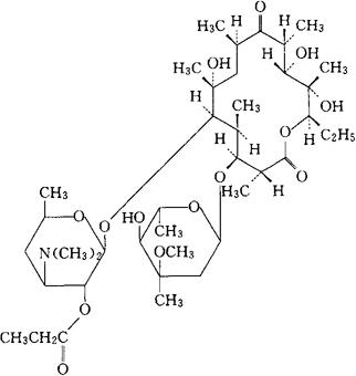 释义 | 丙酸红霉素 C40H71NO14=790.00 CAS-134-36-1 CAS-114-07-8(erythromycin) 红霉素2′-丙酸盐。 Erythromycin 2′-propanoate. 抗生素类药。 红霉素丙酸酯。 Erythromycin Propionate,Propiocine. USAN. |