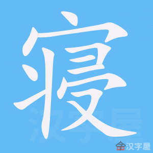 寝,甲骨文=(宀,皇宫)+(羽扇),表示在没有空调设备的古代,帝王休歇、睡觉时,由侍从人员打扇摇风,驱逐蚊蝇,以便帝王安睡。造字本义:帝王在羽扇伺候下安睡。金文承续甲骨文字形。篆文加“人”,强调人的睡觉行为。隶书省去“人”加“爿”(床),强调卧床睡觉。