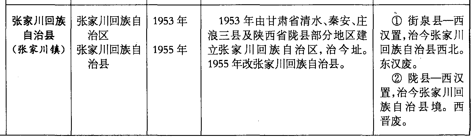 张家川回族自治县(张家川镇)张家川回族自治区张家川回族自治县1953年1955年1953年由甘肃省清水、秦安、庄浪三县及陕西省陇县部分地区建立张家川回族自治区,治今址。1955年改张家川回族自治县。❶ 街泉县—西汉置,治今张家川回族自治县西北。东汉废。❷ 陇县—西汉置,治今张家川回族自治县境。西晋废。