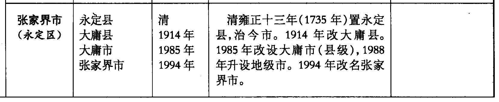 张家界市(永定区)永定县大庸县大庸市张家界市清1914年1985年1994年清雍正十三年(1735年)置永定县,治今市。1914年改大庸县。1985年改设大庸市(县级),1988年升设地级市。1994年改名张家界市。