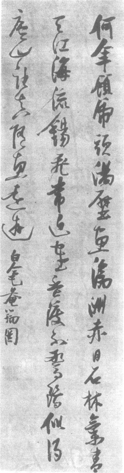 张瑞图行草书五言律诗轴 张瑞图行草书五言律诗轴明。绢本。纵170.2厘米,横47厘米。江苏省苏州博物馆藏。张瑞图(见《张瑞图行草书五言绝句轴》条目)书。五言律诗:“何年顾虎头,满壁画沧州。赤日石林气,青天江海流。锡飞常近鹤,杯渡不惊鸥。似得庐山路,真随惠远游。”款署:“白毫庵瑞图。”行草书笔力矫健、雄强,结字大小错落,各有其势,不拘于常规,以浓墨重笔和跳荡飞动恣肆的书体强化了行草的整体气势,从而给人以博大与散淡、古拙与空灵诸对立因素的合谐感,为人们提供了一个崭新的艺术欣赏天地。