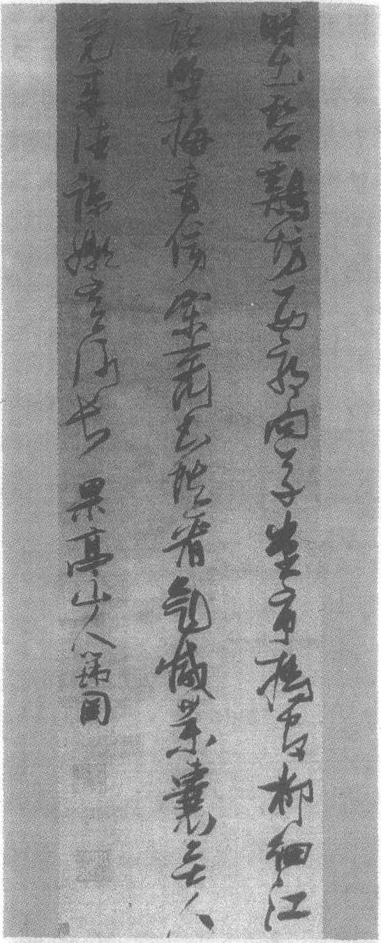 张瑞图行草书五言律诗轴 张瑞图行草书五言律诗轴明。绫本。纵189.5厘米,横55.5厘米。江西省博物馆藏。张瑞图(见《张瑞图草书杜甫诗卷》条目)书。五言律诗:“时出碧鸡坊,西郊向草堂,市桥官柳细,江路野梅香,傍架齐书帙,看题减乐囊,无人觉来往,疏嫩意何长。”款署“果亭山人瑞图”。款下钤白文:<张瑞图印>朱文<大学士章>两印。左下钤朱文<方其道所藏金石书画>收藏印。书体纵横铺排,气势雄伟,刚劲奔放,布局和谐。结构以横取势,笔锋时中时侧,灵动飞舞,既有娴熟的笔法,又有古拙的姿态,给观者展现了一个典雅洒脱的艺术欣赏空间。