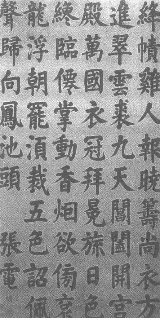 明。纸本。纵183.5厘米,横94厘米。上海博物馆藏。张电,生卒年不详,字文光,号宾山,上海人。书师法于陆深,楷书从沈周、沈灿。其书被华盖殿大学士夏言赏识,以儒士荐于朝,受到明世宗朱厚熜欣赏,官至礼部侍郎。这幅楷书是录唐王维《和贾至舍人大明宫之作》七言律诗:“绛帻鸡人报晓筹,尚衣方进翠云裘。九天阊阖开宫殿,万国衣冠拜冕旒。日色才临仙掌动,香烟欲傍衮龙浮。朝罢须裁五色诏,佩声归向凤池头。张电。”款下钤<张电私印>、<宾山父>两方印。楷书因受沈周影响,字体雍容而偏长,棱角光滑,章法整齐。张电书法传世极少,此书未署明年月,但从字体上看,当为张电中年所写。