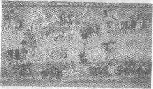 释义 | 张议潮统军出行图壁画 张议潮统军出行图壁画晚唐。纵130厘米,横830厘米。甘肃省敦煌县莫高窟第156窟南壁壁画。唐代安史之乱以后,吐蕃王朝曾一度统治沙州(敦煌),长达69年。九世纪中叶,乘吐蕃王朝发生内乱之机,将领张议潮率河西各族人民推翻吐蕃统治,打通了通往长安之路。唐王朝敕封张议潮为河西节度使,驻节敦煌。为庆贺张的功绩,其侄张淮深约在咸通五年(公元864年)开凿了莫高窟第156窟,并在窟中的南北两壁绘制了“张议潮统军出行图”和“宋国河内郡夫人宋氏出行图”。“张仪潮统军出行图”由百余人组成,画面呈横卷式,从右向左依次展现。全图作鸟瞰式布局。出行队伍主要分两列,作对称式排列,依次为鼓、角手、武骑队、文骑队,两队文骑之间是随军营伎。乐师12人分别演奏琵琶、横笛、箜篌、竖笛等乐器;舞伎八人分两组对舞。随后有执旗者,持幡者和持“旌节”者(节度使最高权力的特征)。榜题“衙前兵马使”。跟随着衙前兵马使三骑,“散押衙”二骑,接下来才是此图的中心人物张议潮。他在图中形象较大,占突出地位:戴幞头,穿红袍,系革带,骑白马,榜题“河西十一州节度使张议潮口除吐蕃收复河西一行图”。其后有子弟军相随,拥“信”字大旗。此后是二十余骑,为猎骑和驮运队等。整个画面队伍浩荡,气势宏大,人物姿态各异。构图疏密有致,并以平远山水和绿树为点缀。从图中严整的军威和欢乐的乐舞均看出张议潮在当地统治的盛况。 ☚ 弥勒经变图(嫁娶)壁画 善友太子入海求宝图(局部)壁画 ☛ |