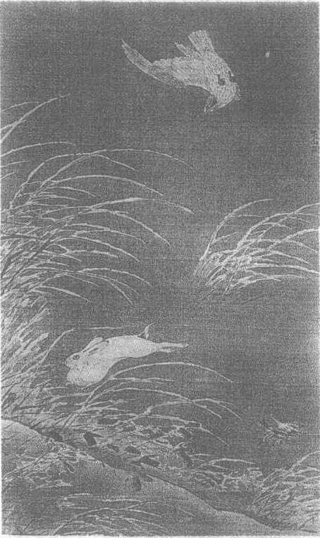 绢本,墨笔。纵158.2厘米,横97.3厘米。现藏南京博物馆。画中茫茫荒野,萧风瑟瑟,杂草丛丛在狂风中摇曳。就在这荒凉的气氛中,禽鸟、动物的生已很艰难,恰在这时,一只老鹰趁火打劫,一只野兔突遭袭击,野兔似乎用兜圈子战术与老鹰周旋,鹰穷追不舍。吓得其它禽鸟到处乱窜。一派萧杀不安的气氛。形象刻画细致入微,准确生动。画家有意抓取大自然中富有激动人心的情节,更能显示万物的生机勃勃,从而对观众更具吸引力。
