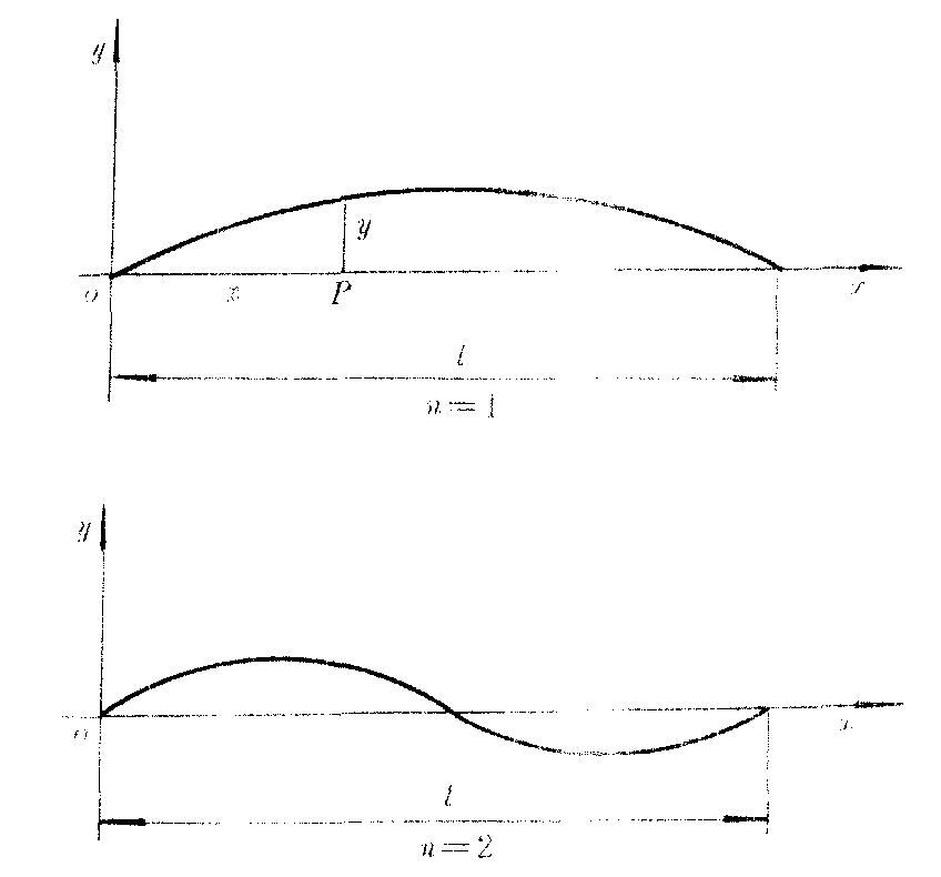 …),即对于两端固定的弦,振动频率具有一系列特定的数值,fn=f1,f2,f3,…。且仅由弦本身的固有力学参量(l,T和ρ)决定,故称fn为弦的固有振动频率。注意,谐振子仅有一个固有频率,而弦的固有频率有n个,且必须满足fn=n/2l