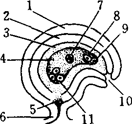 释义 | 弯生胚珠campylotropous ovule珠孔、合点与珠柄不在一直线上的一种弯曲类型的胚珠。如大豆、豇豆等植物的胚珠,在其发育过程中,一边生长较快,致使胚珠略向一侧弯曲,珠孔面向胎座。有的植物胚珠弯曲程度更大,通过珠孔、胚囊、合点与珠柄的连线更为弯曲,珠心和胚囊呈马蹄形,称为曲生胚珠,如中央子目、泽泻科等植物的胚珠。 弯生胚珠 1.外珠被 2. 内珠被 3. 珠心 4.胚囊 5. 合点 6. 珠柄 7. 极核 8. 卵细胞 9. 助细胞 10. 珠孔 11. 反足细胞 |