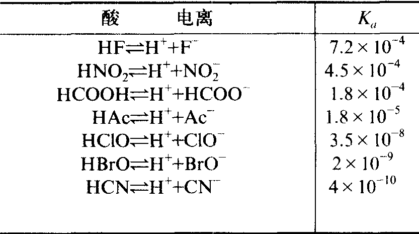 ❷ 弱酸的电离平衡 弱酸在水溶液中也存在电离平衡,如醋酸在水溶液中的电离平衡为: 更确切的表示方法: 应用质量作用定律可得: 因形成H3O+所消耗的水的物质的量与稀溶液中水的总物质的量相比可忽略不计,所以水的物质的量浓度可看做常数,即 Ka称为弱酸的电离常数。Ka基本上不随浓度改变,如醋酸浓度在0.1~0.01mol·L-1范围内时,其Ka值在1.82×10-5与1.80×10-5之间。一元弱酸的电离常数见表2。
