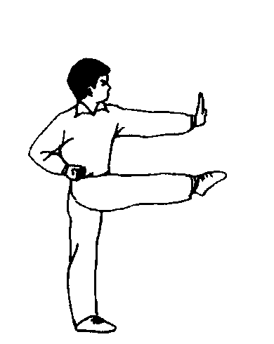 又称弹腿推掌,为弹踢与推掌同时完成的基本动作。行进练习同弹腿冲拳。教学重点 同于弹腿冲拳、唯强调立掌。