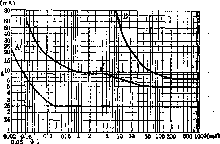 其中λ·μ·θ均为常数。正常情况下按此公式所绘出的曲线为靠近座标轴的等边双曲线。为求关系曲线准确,一般应取8~12个点,即应用8~12种作用时间渐次缩短的方形脉冲,刺激肌肉引起收缩,确定其阈值,然后将此数值在对数式座标纸上定点并联成曲线。正常曲线起始段,即作用时间自1000ms至1ms的阈值数值相等,故各点联成与横座标平行的直线,其后作用时间在0.3→0.1 ms时,阈值逐渐上升,联成的曲线逐渐向上弯曲,再后于0.03→0.01ms段曲线陡直上升,几与纵座标平行。有人认为此曲线前半为肌肉反应曲线,其后半为神经反应曲线,但实际上在正常情况下,无论宽窄脉冲刺激时,都是通过神经而起作用。所表现的是神经的功能曲线。只有在完全失去神经支配时,刺激肌肉才是肌肉本身的反应。失神经曲线:由于肌肉兴奋性低,对于作用时间较短的方波脉冲不起反应,对宽脉冲刺激虽起反应但所需阈值较大,因此在失神经支配肌肉测绘的强度-时间曲线将产生变化。完全失神经时,仅能测得脉冲宽度大于1~10ms的阈值,曲线向座标右上方移动,曲线斜率增大,但曲线光滑;部分失神经时,肌肉中一部分功能正常的神经对小于1ms的短脉冲尚起反应,但阈值升高,整个曲线稍向右上方移动,斜率增大,阈值的升高与作用宽度呈不完全的直线关系,在某一阶段 (10~1ms或1~0.1ms) 阈值上升缓慢,继后又上升较快,以致在曲线上出现弯折(亦称纽结)。有人认为弯折的左段表示有神经支配部分,弯折的右段为肌肉本身曲线,为此从曲线可以半定量地看出有神经支配与失神经部分比数(如图)。